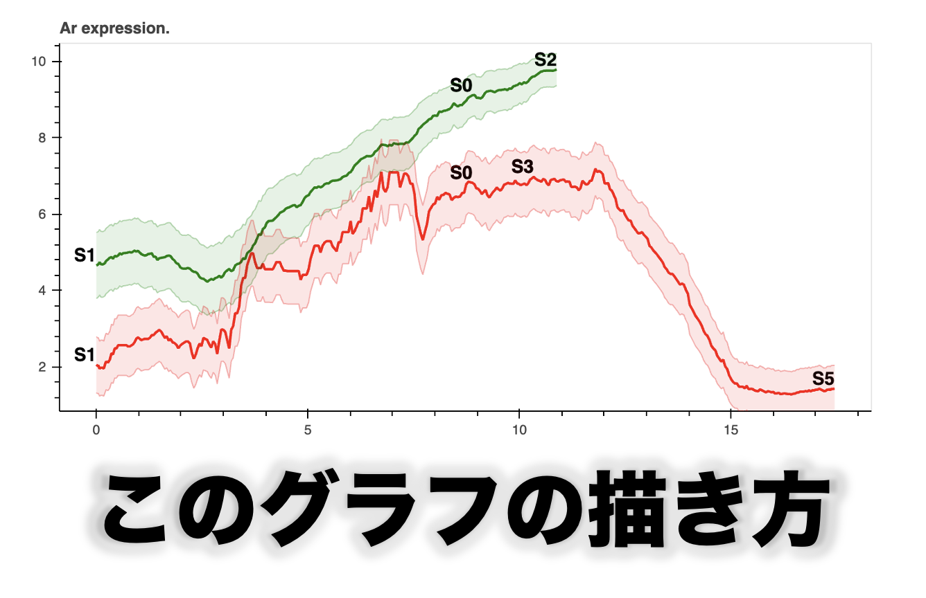サムネのグラフはsingle cell RNA-Seqのデータに対してSTREAMというツールを用いてUMAPによって次元削減した後にTrajectoryを描画し、Trajectoryを横軸にした場合の特定の遺伝子の発現量の変化を描画したものであり、描画には少々手間がかかります。